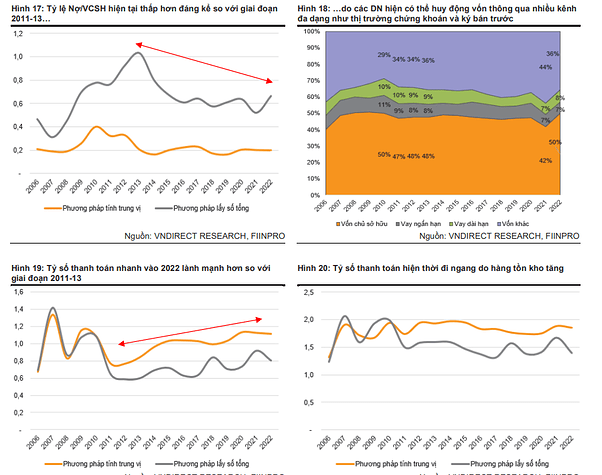 Sức khỏe tài chính của các Doanh nghiệp này hiện tốt hơn so với giai đoạn 2011-13 với tỷ lệ đòn bẩy thấp hơn và khả năng thanh toán nhanh khỏe hơn. Tỷ lệ hàng tồn kho vẫn duy trì mức cao nhưng HTK/TTS đã thấp hơn nhiều giai đoạn trước → Áp lực vơi bớt.