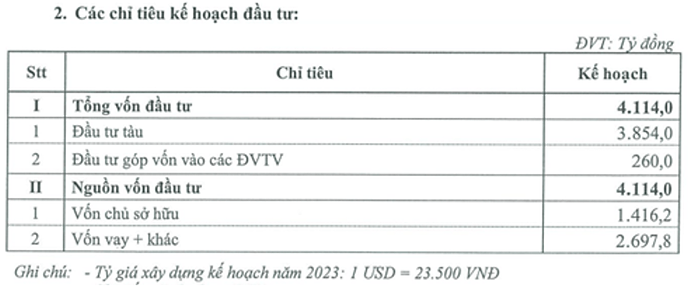 Trong nguồn vốn đầu tư thì vốn gần như là để dành đầu tư tàu mới và theo thông tin của ban lãnh đạo thì trong năm 2023 dự kiến chỉ có thể đầu tư thêm được 4 tàu (dự kiến 2 tàu sẽ nhận trong tháng 5,6/2023) do nguồn cung thắt chặt.