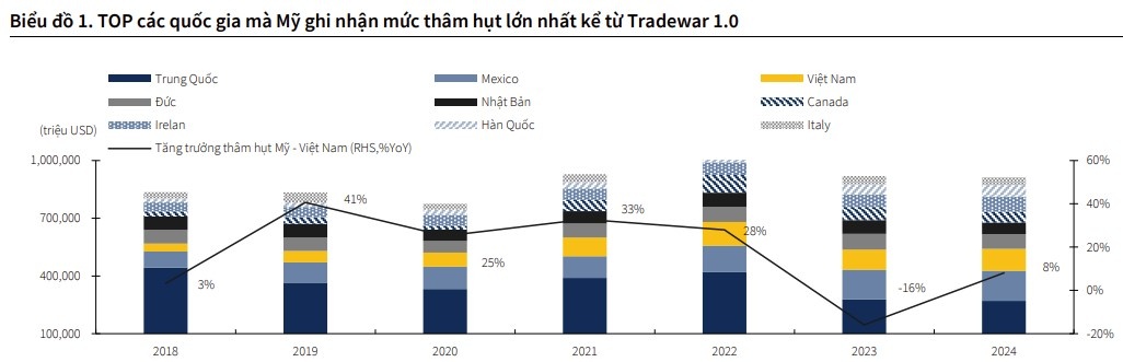 Giống như các quốc gia kể trên, thặng dư thương mại của Việt Nam với Mỹ đã tăng đáng kể trong thập kỷ qua, do xuất khẩu từ Việt Nam tăng mạnh. Mỹ là điểm đến xuất khẩu lớn nhất của Việt Nam, chiếm gần 30% tổng kim ngạch xuất khẩu của Việt Nam năm 2024.