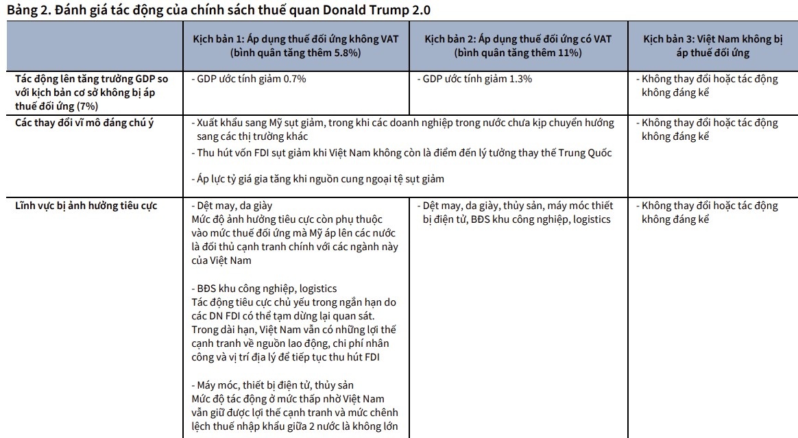 KỊCH BẢN 1 (40% khả năng): Mỹ áp thuế đối ứng nhưng không tính đến VAT, với mức thuế bình quân tăng thêm 5,8% đối với hàng hóa từ Việt Nam. Trong trường hợp này, GDP có thể giảm 0,7%, xuất khẩu sang Mỹ sẽ bị ảnh hưởng đáng kể khi doanh nghiệp chưa kịp chuyển hướng sang thị trường khác. Thu hút vốn FDI có thể chững lại, áp lực tỷ giá gia tăng do nguồn cung ngoại tệ suy giảm.