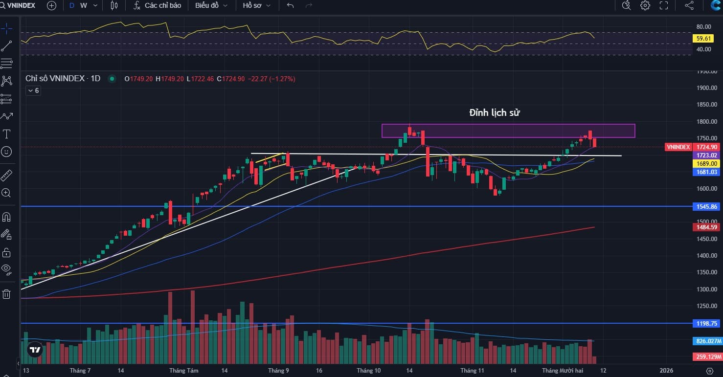 - Duy trì trạng thái nắm giữ danh mục và mở thêm vị thế MUA . Khả năng gặp áp lực bán nhẹ ở vùng giá cao đang gia tăng khi VN-Index tiến gần vùng đỉnh cũ (nhỏ lẻ đầu cơ, quan ngại đỉnh). Thì những nhịp điều chỉnh xuất hiện sẽ là cơ hội để tham gia. Tập trung vào những cổ cơ bản còn định giá thấp, nhóm ngành tốt trong năm tới. Chiến lược là nên mua khi điều chỉnh, chưa nhất thiết phải vội mua break (nhiều rủi ro hơn) bởi TT tác động với nhón VIN.