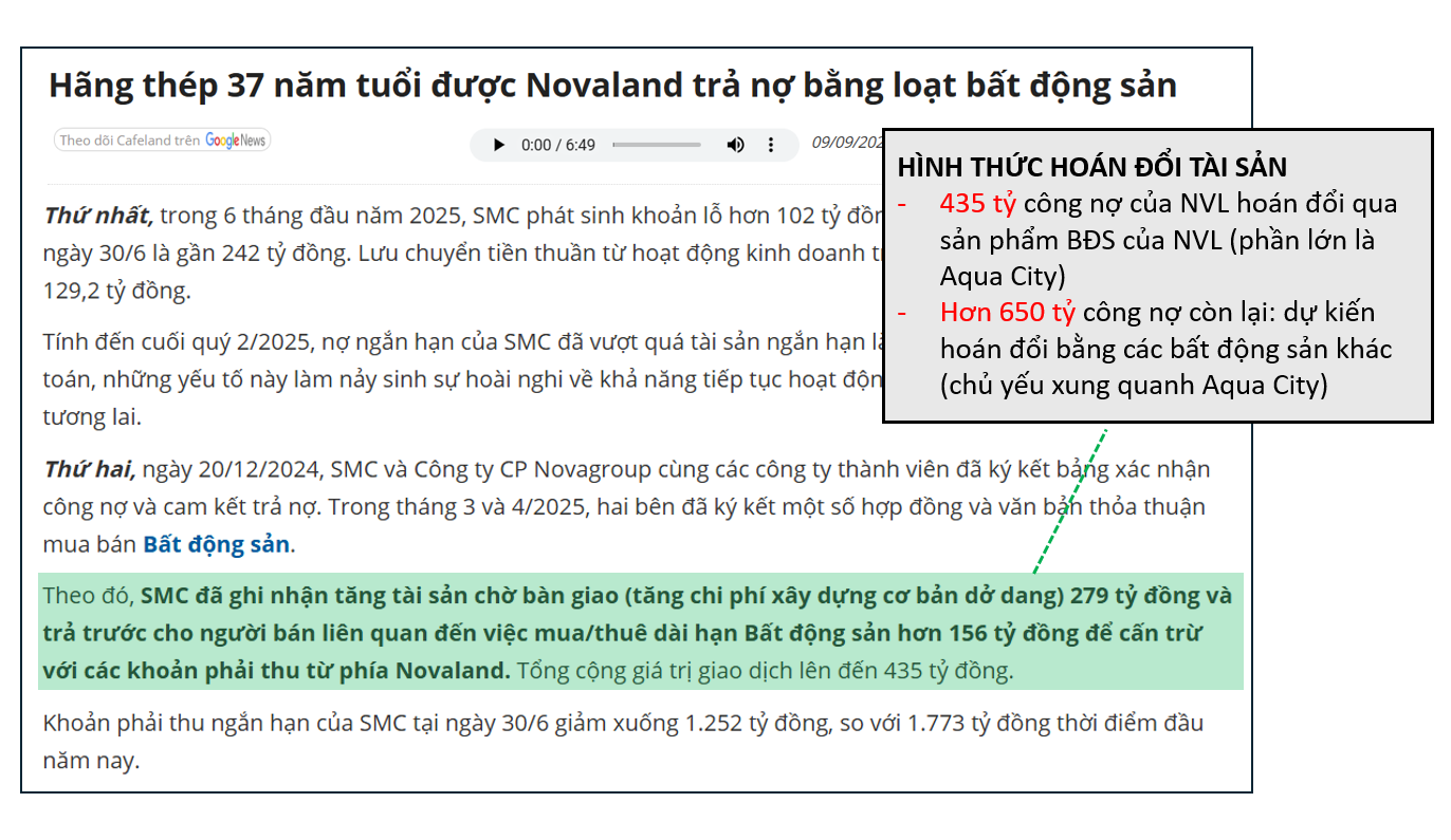 Theo đó, Vào tháng 12,2024, NVL đã ký kết bảng xác nhận công nợ và cam kết trả nợ cho SMC, đặc biệt,trong tháng 3 và tháng 4 năm nay, NVL đã ký với SMC hợp đồng mua bán BĐS (phải hiểu rõ việc hoán đổi này thực chất là làm đẹp bảng cân đối, chứ rủi ro ko mất đi mà chuyển đổi rủi ro tín dụng sang rủi ro của thị trường bất động sản)