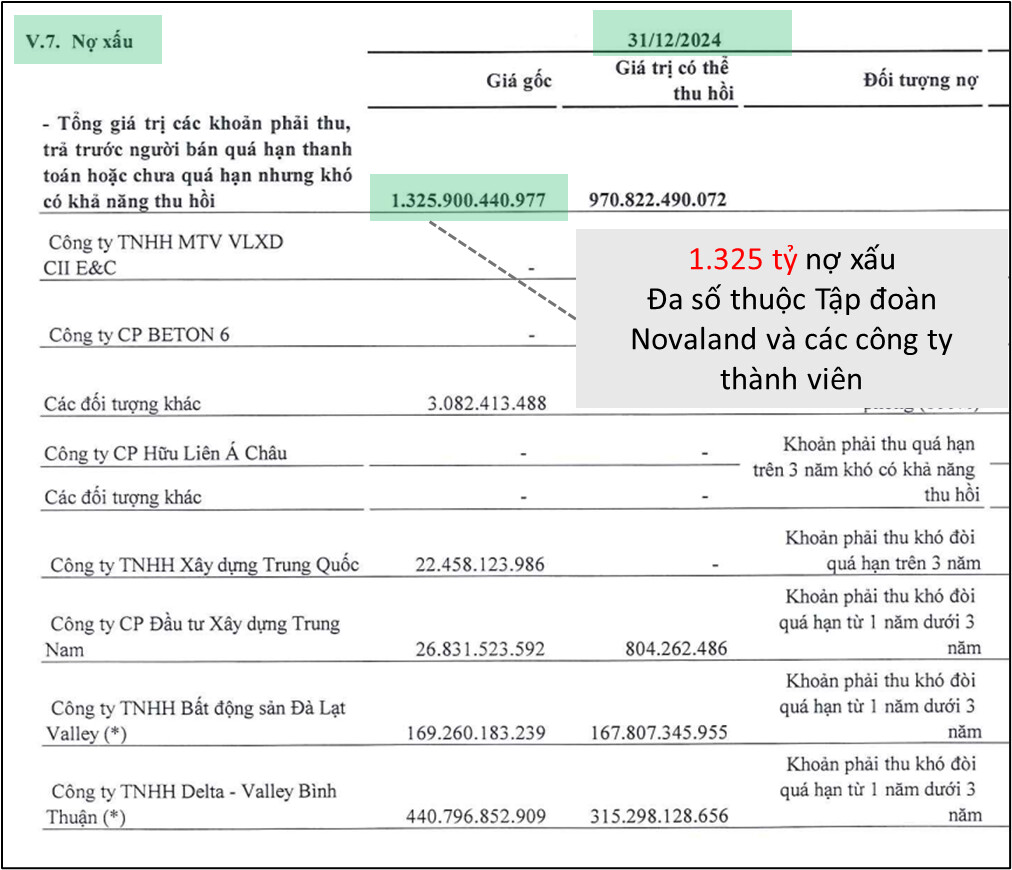 Nhưng trong thời gian đợi tiền về, thị trường bất động sản sụp đổ, NVL mất khả năng thanh toán. Tính đến cuối 2024, toàn bộ công nợ biến thành nợ xấu , quá hạn thanh toán từ 1 đến 3 năm, đã lên tới 1.325 tỷ. Đa số thuộc Tập đoàn Novaland và các công ty thành viên.