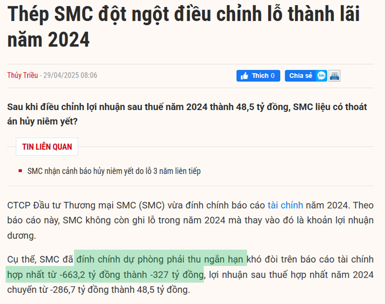 Và nếu 1 doanh nghiệp bị lỗ 3 năm niêm yết, sẽ có nguy cơ bị hủy niêm yết bắt buộc. Tuy nhiên, sau kiểm toán, SMC khả năng đã điều chỉnh lại BCTC khéo léo, giảm phần dự phòng phải thu ngắn hạn từ âm 663 tỷ xuống 327 tỷ, từ đó giúp DN từ lỗ sang lãi nhẹ 12 tỷ, giúpthoát án hủy niêm yết