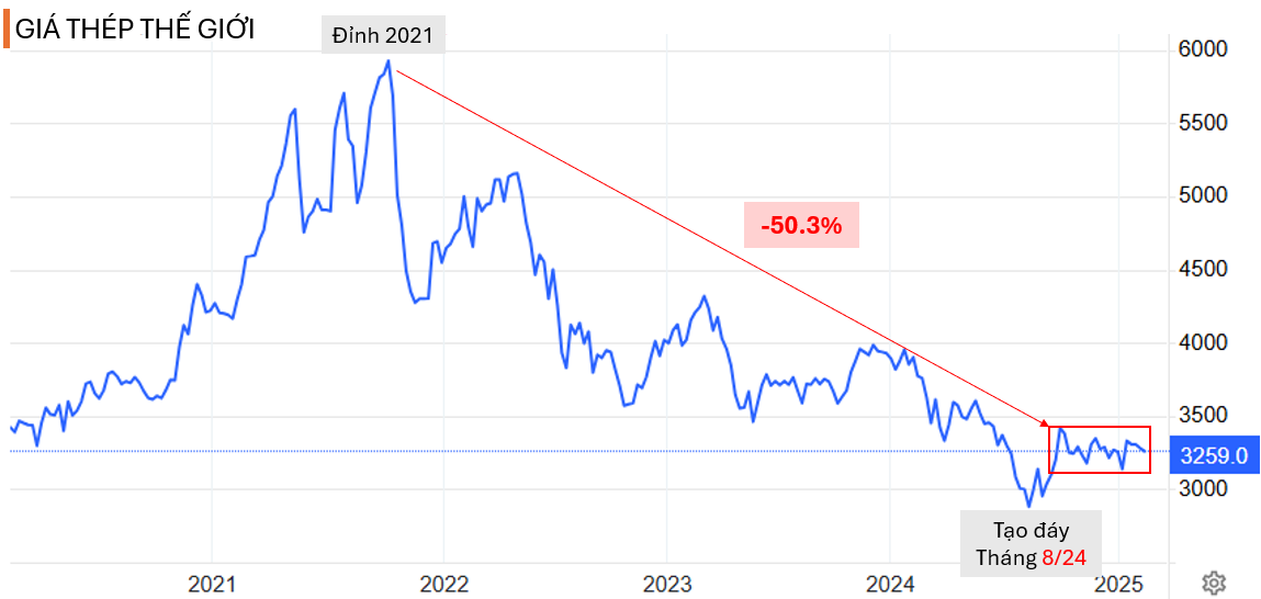 Từ giữa năm 2022, toàn ngành bắt đầu chịu sự ảnh hưởng nặng nề từ cuộc khủng hoảng kéo dài của thị trường bất động sản. Giá thép toàn cầu sau giai đoạn tạo đỉnh cuối 2021 đã rơi mất 50% , tạo sức ép khổng lồ lên hàng tồn kho và buộc doanh nghiệp phải trích lập dự phòng ở mức chưa từng có.