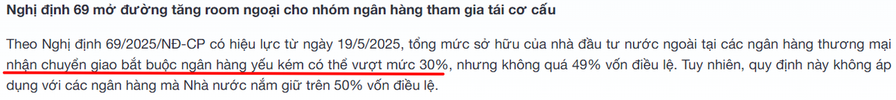 Tuy nhiên với nghị định 69 đã có hiệu lực từ ngày 19/05/2025 đã mở ra cơ hội rất tốt cho các cổ phiếu ngân hàng nhận chuyển giao bắt buộc các ngân hàng yếu kém như HDB - VPB - MBB có thể nâng room ngoại lên đến 49% từ đó giúp các ngân hàng này cải thiện tiêu chí FOL để góp mặt vào danh mục FTSE EM trong tương lai gần.