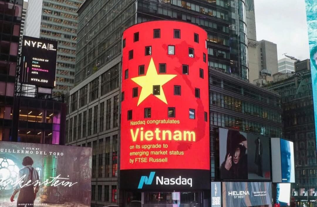 Dòng chữ: “Nasdaq congratulates Vietnam on its upgrade to emerging market status by FTSE Russell” (Nasdaq chúc mừng Việt Nam được nâng hạng lên thị trường mới nổi bởi FTSE Russell) xuất hiện giữa trung tâm phố Wall thế giới, không chỉ là niềm tự hào mà còn khẳng định vị thế ngày càng quan trọng của Việt Nam trên bản đồ tài chính quốc tế.