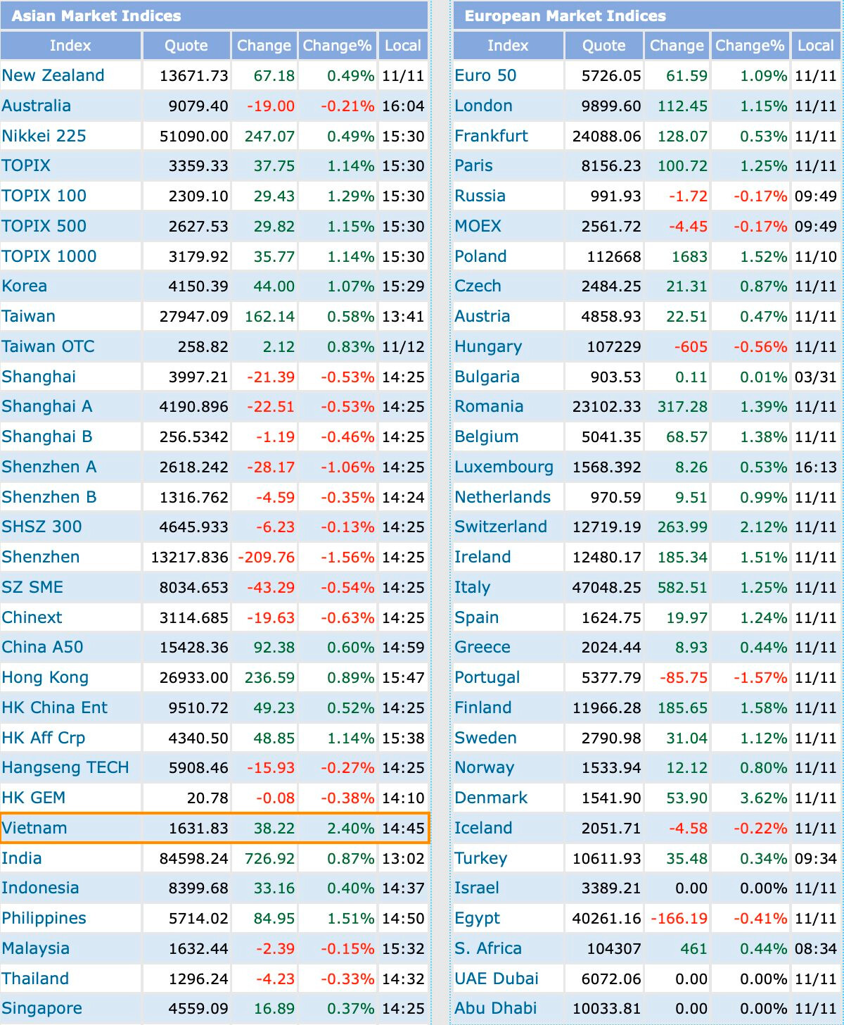 Mức tăng 2,4% đưa chứng khoán Việt Nam trở thành thị trường tăng mạnh thế giới ngày 12/11. Phiên tăng mạnh thứ 2 liên tiếp mở ra kỳ vọng kết thúc nhịp điều chỉnh kéo dài từ giữa tháng 10. Trước đó, pha điều chỉnh khiến VN-Index có lúc đã mất đến 185 điểm (khoảng hơn 10%) từ đỉnh và lùi về vùng 1.580 điểm.