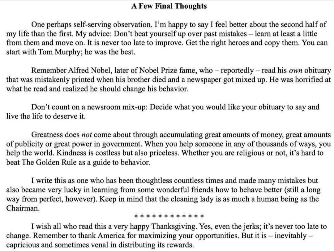 Tôi chúc mọi người một mùa Lễ Tạ Ơn thật đầm ấm. Vâng, kể cả đối với những kẻ khó ưa – vì chẳng bao giờ là quá muộn để thay đổi cả. Hãy biết ơn nước Mỹ, nơi đã mang đến cho ta nhiều cơ hội, nhưng cũng đừng quên rằng cách nó phân phát cơ hội và phần thưởng không phải lúc nào cũng công bằng hay dễ đoán.