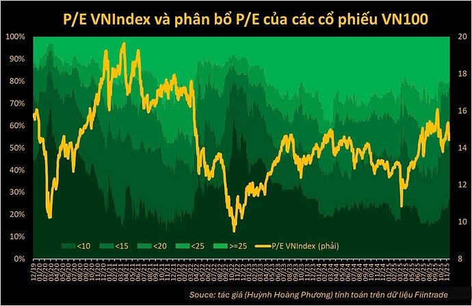 Tuy nhiên, các dữ liệu cũng cho thấy đây chưa phải là thời kỳ “vàng” của tích sản. Số lượng cổ phiếu có P/E dưới 10 hay dưới 15 vẫn thấp hơn rõ rệt so với các giai đoạn tạo đáy trung hạn, đồng nghĩa với việc thị trường vẫn có thể chiết khấu thêm khoảng 20% nếu xuất hiện rủi ro lớn, dù xác suất hiện tại không cao.