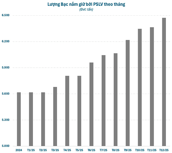 Trong khi đó, một quỹ Bạc lớn khác là Sprott Physical Silver Trust USD (PSLV) cũng mạnh tay mua thêm trong tháng 12, với khoảng 4 triệu oz (125 tấn). Hiện tại, quỹ đang nắm hơn 208 triệu oz Bạc (~6,5 nghìn tấn), tương đương quy mô tài sản gần 14,4 tỷ USD. PSLV là một trong những quỹ bạc vật chất lớn nhất thế giới, đại diện cho triết lý “bạc thật” của Sprott Asset Management LP.