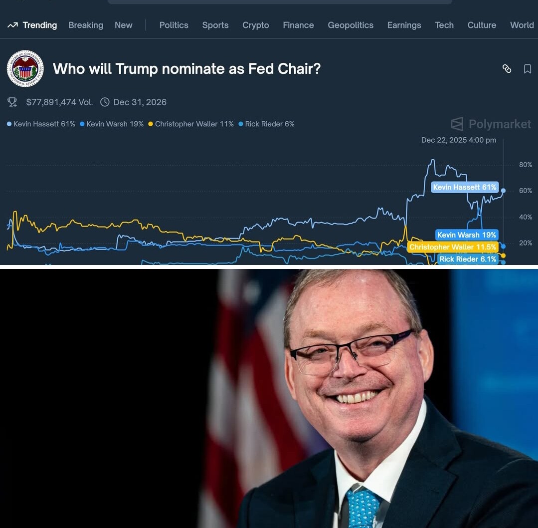 Tổng thống Trump có thể công bố người được để cử làm Chủ tịch Fed mới ngay trong tuần đầu tiên của tháng 1, và dữ liệu từ Polymarket cho thấy 61% đang nghiêng về ông Kevin Hassett, Giám đốc Hội đồng Kinh tế Quốc gia.