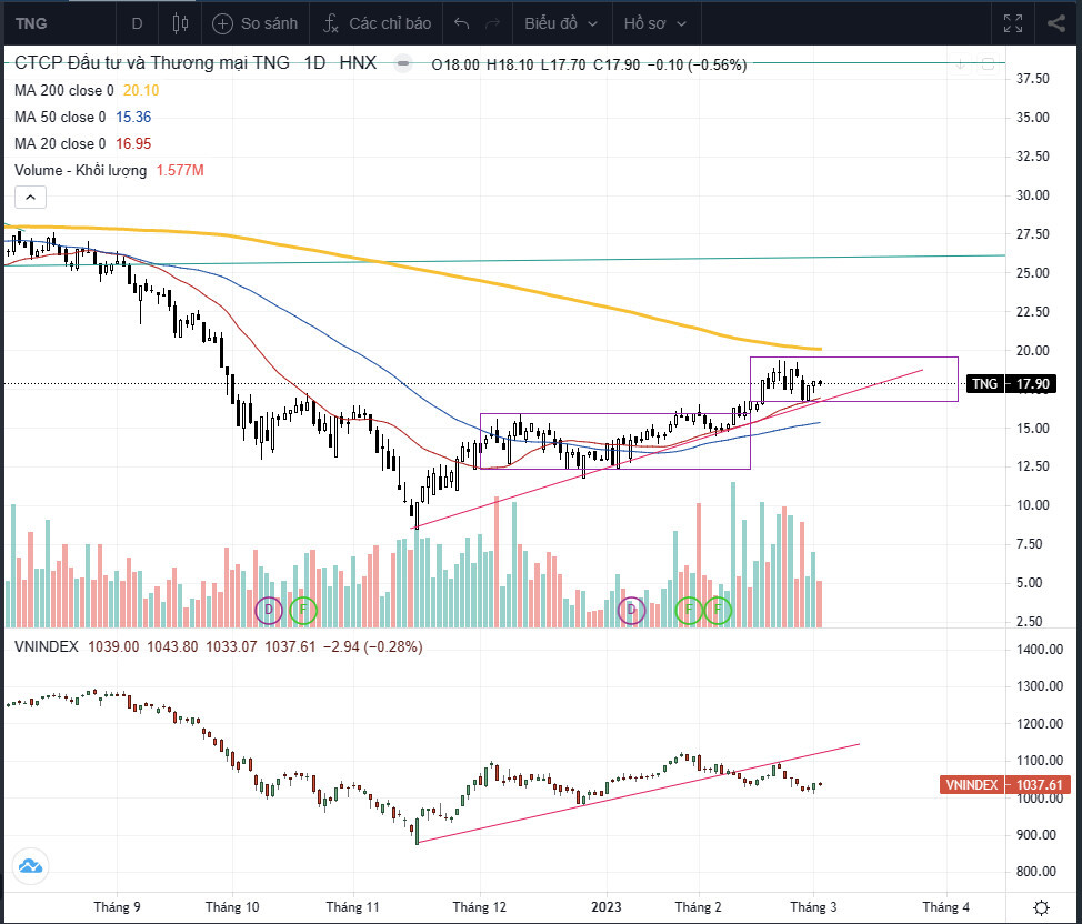TNG gặp kháng cự ngay quanh vùng MA200 và sự điều chỉnh mạnh, nhưng vẫn tiếp nhận lực cầu hấp thụ tốt quanh MA20 (quanh vùng giá từ 16.8 - 17).