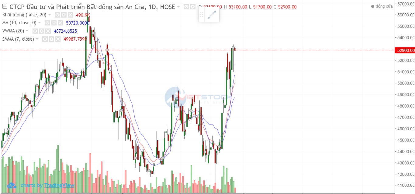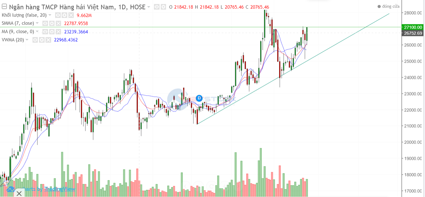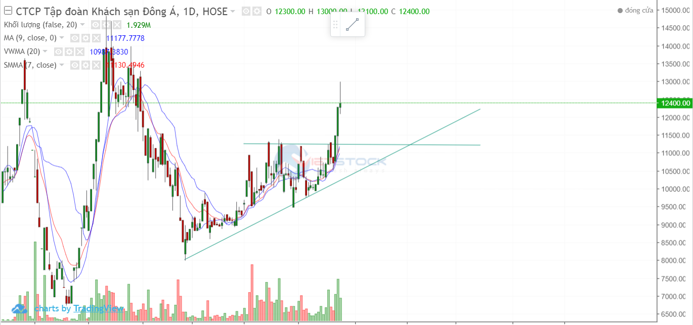 2 phiên trần liên tiếp giúp cổ phiếu vượt qua ngưỡng kháng cự và bước vào trend tăng dài hạn với sự hộ trợ của đường MA20 và VWMA.