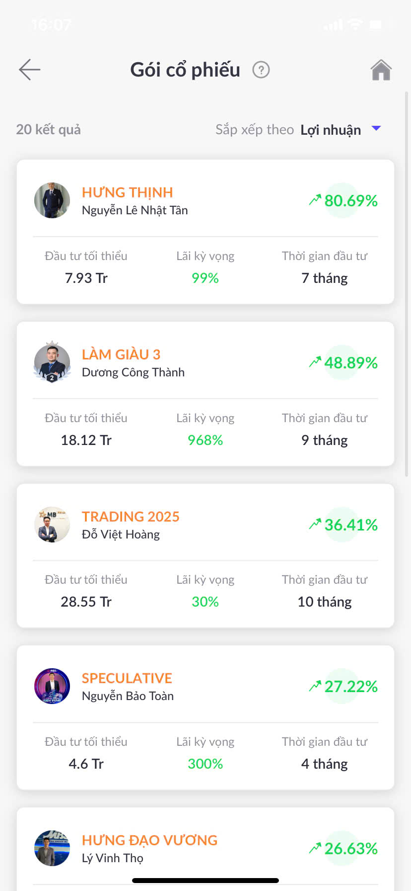 Hoặc mọi người có nhiều hơn thì có thể để thêm tiền vào Gói cổ phiếu, sản phẩm danh mục thiết kế sẵn của MBS ở trên nền tảng Digi Trading ở MBBank nhé, gói cao nhất hiện tại lãi cũng phải được 80%, quá là lời cho những nhà đầu tư F0 chưa có nhiều kinh nghiệm
