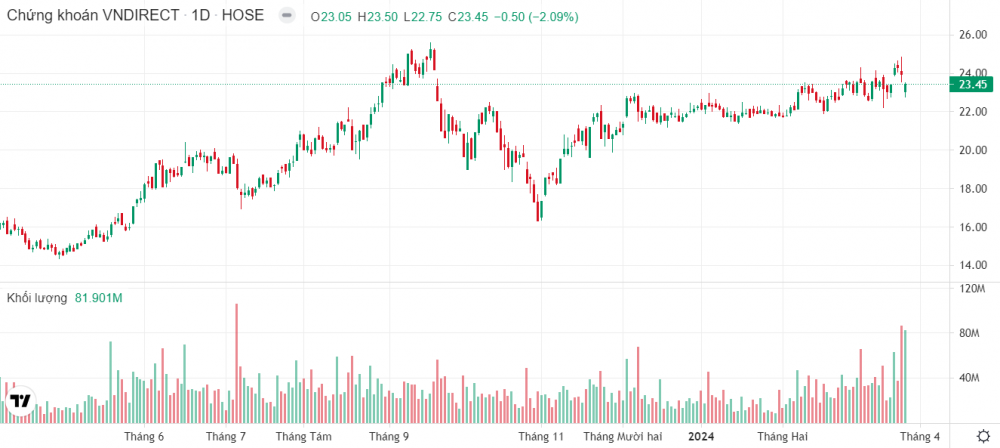 Kết phiên giao dịch ngày 26/3, có thêm gần 82 triệu cổ phiếu VND của Chứng khoán VNDirect được sang tay, giá trị tương ứng 1.891 tỷ đồng. Đây đều là các mức cao thứ 3 trong lịch sử giao dịch 15 năm của cổ phiếu ngành chứng khoán.