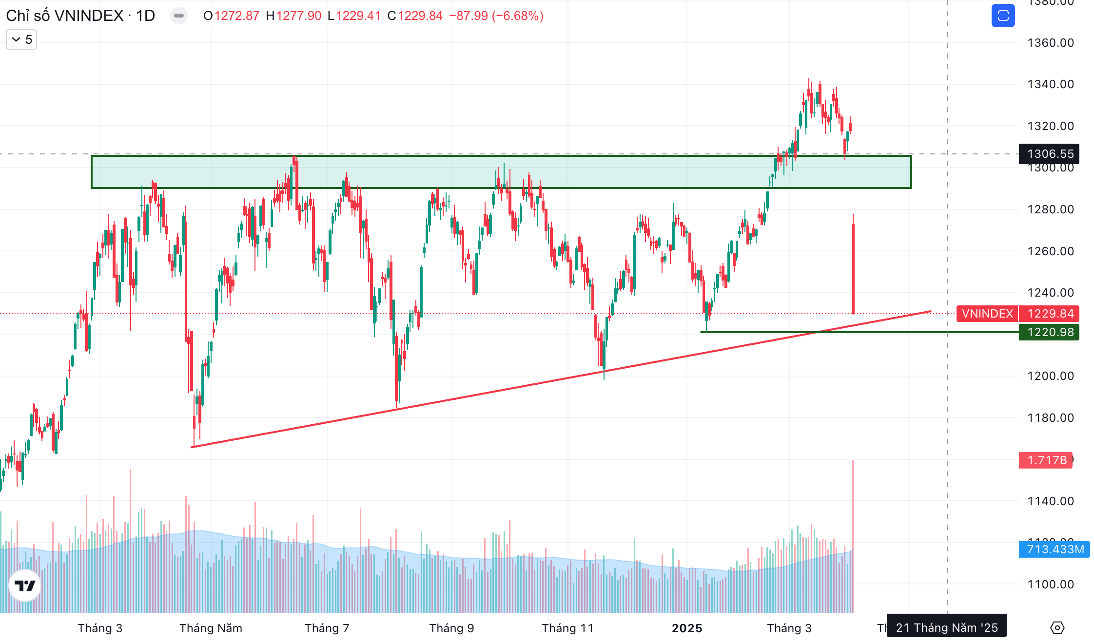 Thuế đối ứng làm giảm triển vọng tươi sáng của kinh tế Việt Nam, thị trường chứng khoán phản ánh bằng mức giảm ~7%, bẻ gãy hoàn toàn xu hướng tăng trước đó. (Hình 1)