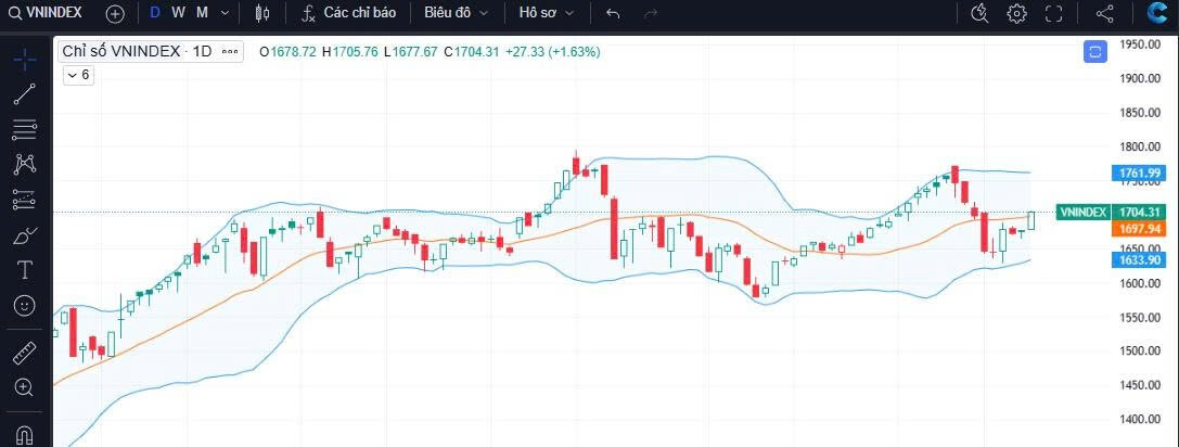 Vnindex tăng 27.33 điểm, tương ứng 1.63%. Đóng cửa 1704.31 điểm với thanh khoản 3 sàn: GTGD 26.216 tỷ đồng, KLGD 904 triệu cp (thấp hơn trung bình 20 phiên gần nhất). Toàn thị trường có 377 mã tăng giá, 828 mã đi ngang và 336 mã giảm giá.