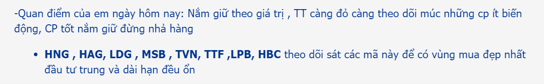 -Quan điểm của em ngày hôm nay: Nắm giữ theo giá trị , TT càng đỏ càng theo dõi múc những cp ít biến động, CP tốt nắm giữ đừng nhả hàng