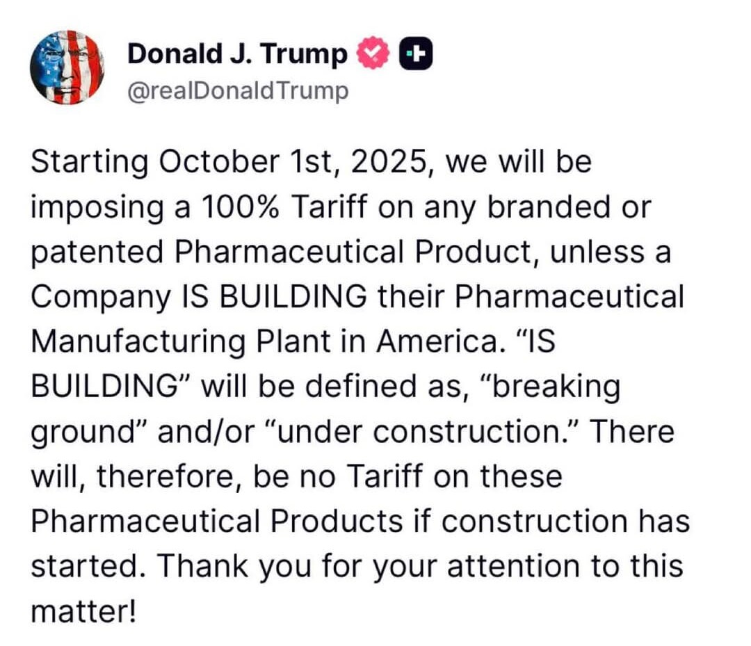 “Bắt đầu từ ngày 1 tháng 10 năm 2025, chúng tôi sẽ áp dụng mức thuế 100% đối với bất kỳ Sản phẩm Dược phẩm có thương hiệu hoặc được cấp bằng sáng chế nào, trừ khi một Công ty ĐANG XÂY DỰNG Nhà máy Sản xuất Dược phẩm của họ tại Hoa Kỳ…” - Tổng thống Donald J. Trump ![]()