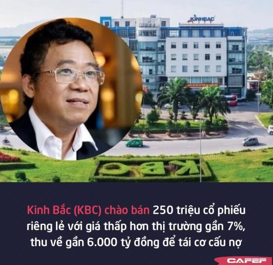 Tổng Công ty Phát triển Đô thị Kinh Bắc (KBC) thông báo chào bán 250 triệu cổ phiếu với giá 23.900 đồng/cp, thấp hơn 6,8% so với giá thị trường, nhằm thu về gần 6.000 tỷ đồng để tái cơ cấu nợ.