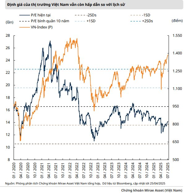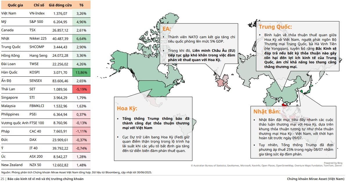 Báo cáo chiến lược tháng 7 của Chứng khoán Mirae Asset nhận định rằng việc kịch bản xấu nhất về thuế quan không xảy ra đã giúp thị trường chứng khoán khởi sắc trong tháng 6, đồng thời giúp VN-Index chinh phục vùng cản tâm lý 1.400 điểm.