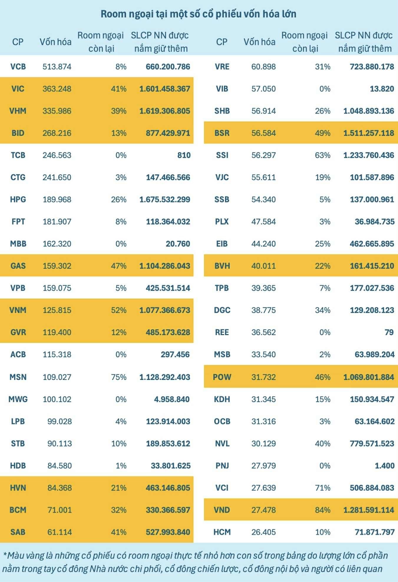 Cần phải lưu ý rằng, nhiều cổ phiếu trong danh sách trên có room ngoại thực tế thấp hơn nhiều do lượng lớn cổ phiếu đang nằm trong tay cổ đông Nhà nước chi phối, cổ đông chiến lược, cổ đông nội bộ và người có liên quan.