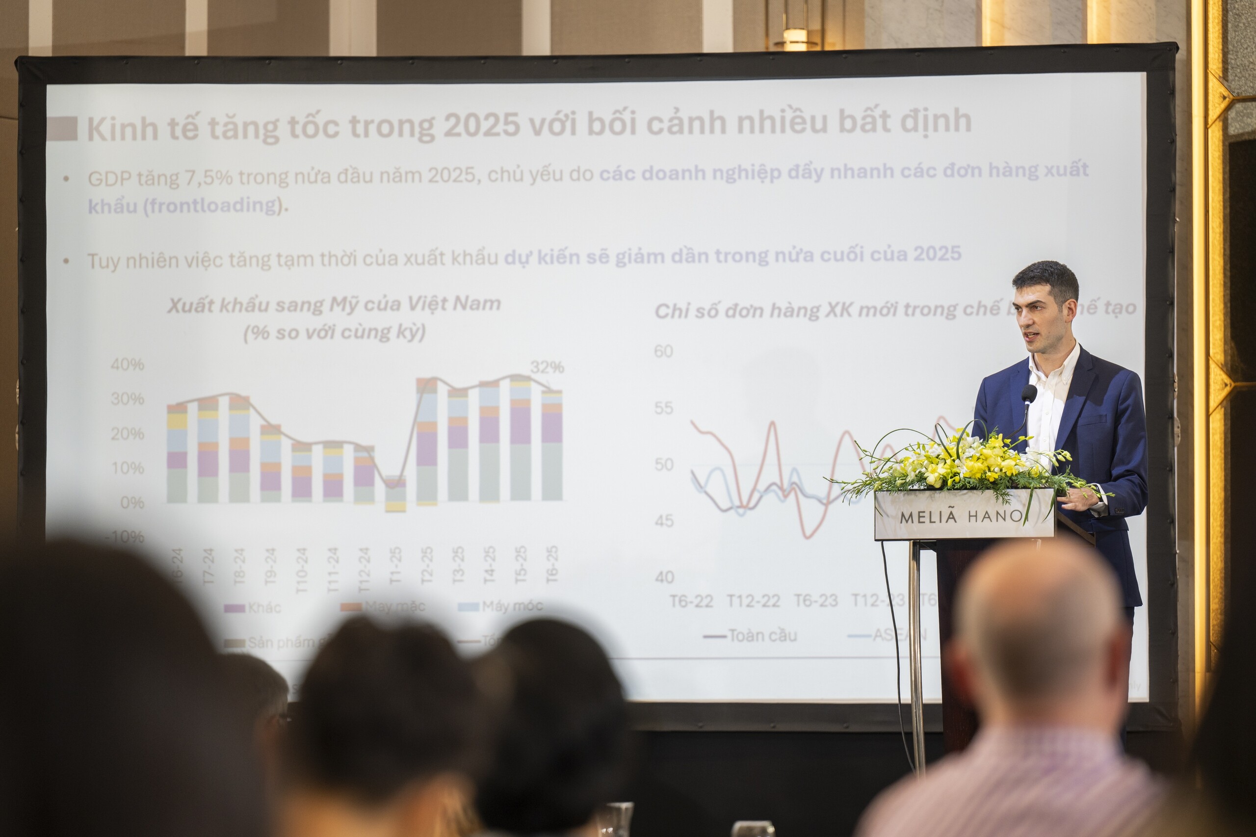 Sau đà tăng trưởng mạnh mẽ nhờ xuất khẩu sớm tăng mạnh trong nửa đầu năm, kinh tế Việt Nam được dự báo sẽ tăng chậm lại trong phần còn lại của năm khi xuất khẩu dần trở về quỹ đạo bình thường. Là nền kinh tế định hướng xuất khẩu, Việt Nam tiếp tục chịu tác động từ triển vọng tăng trưởng toàn cầu suy yếu và nhu cầu giảm từ các đối tác thương mại lớn. Bên cạnh đó, những bất định về chính sách thương mại có thể ảnh hưởng tới niềm tin tiêu dùng và doanh nghiệp.