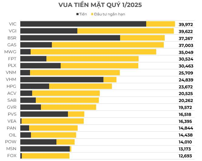 các ông vua tiền mặt nhiều nhất trên sàn hiện nay. Cứ đem so với vốn hoá hiện nay là 1 manh mối biết cổ nào đang định giá rẻ hay đắt…