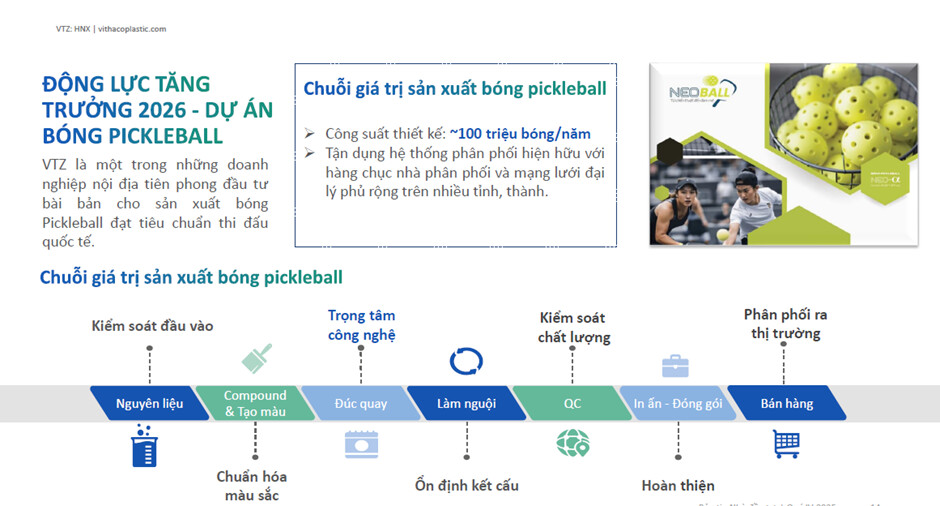 Sản phẩm ngách đầy tiềm năng: Ngoài nhựa công nghiệp, việc dẫn đầu thị trường bóng Pickleball - một môn thể thao đang bùng nổ toàn cầu - cho thấy sự nhạy bén cực cao của ban lãnh đạo DN trong việc tìm kiếm biên lợi nhuận mới.