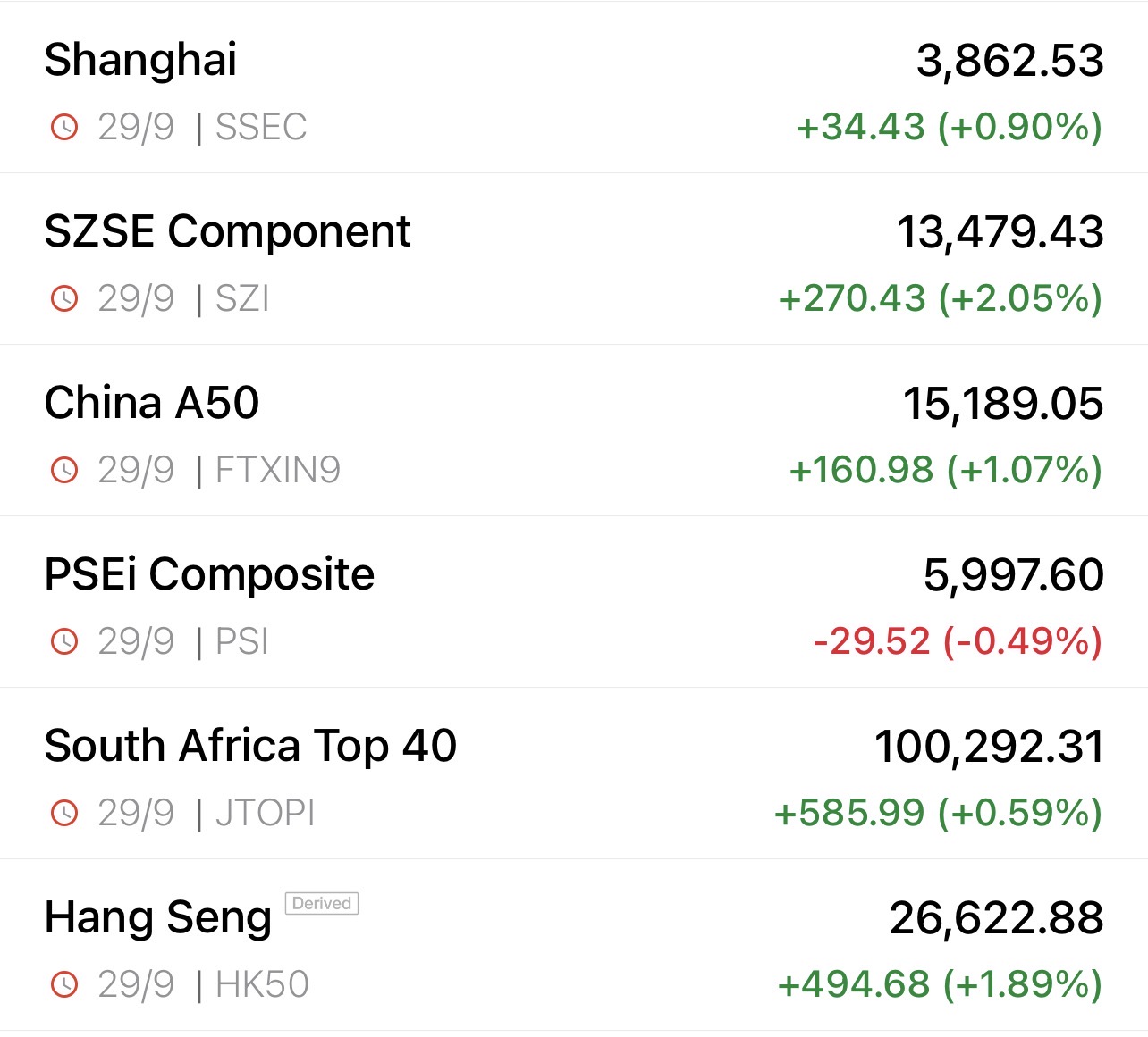 Trung Quốc tiếp tục tăng mạnh: Thẩm Quyến, Hồng Công tăng 2%.