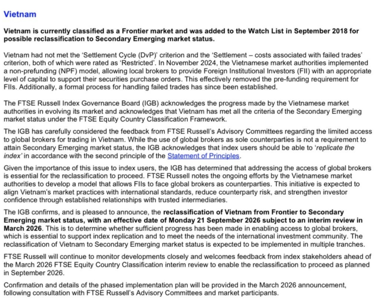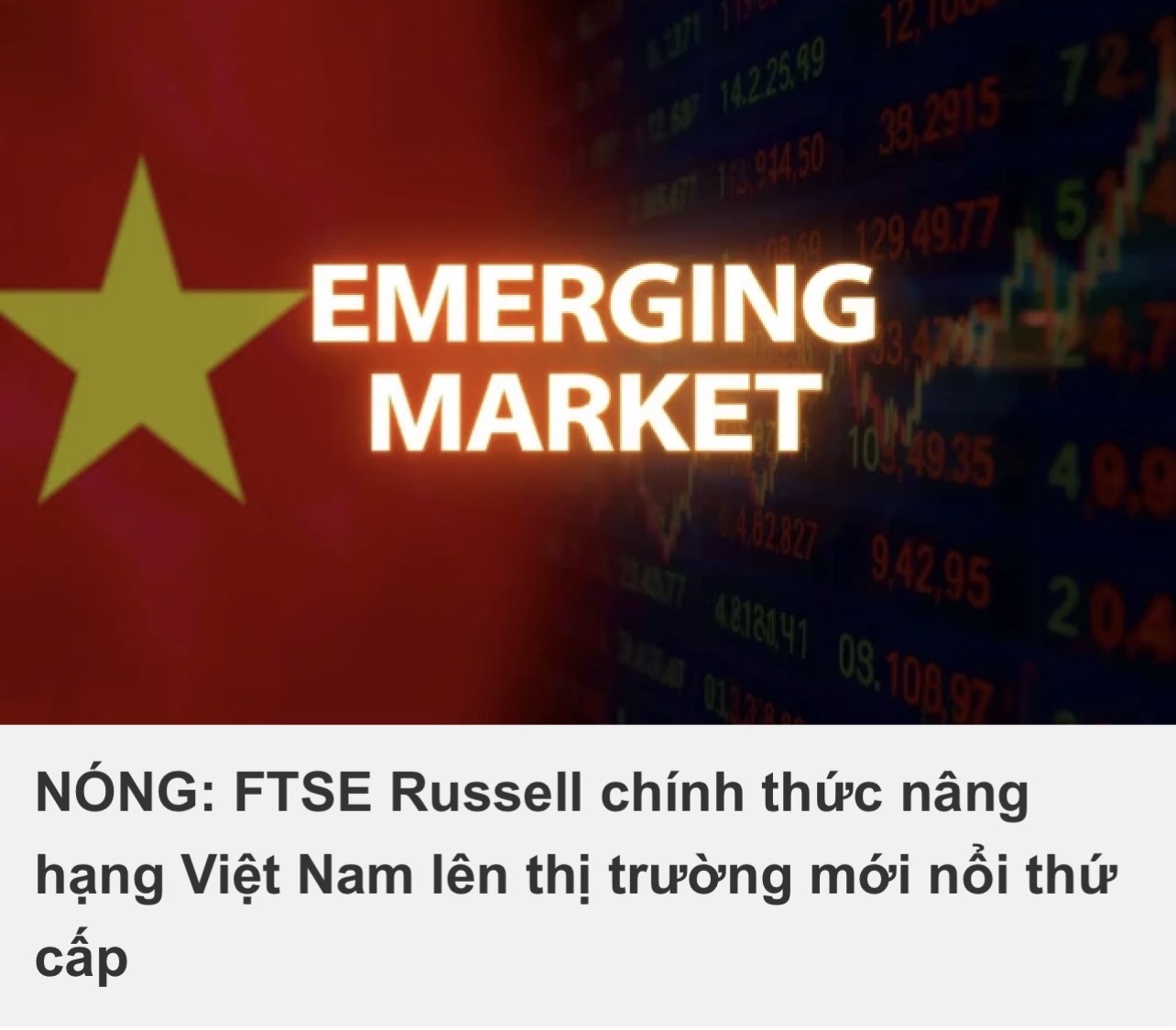 Ngày 8/10/2025 (vào lúc 03 giờ 00 phút theo giờ Hà Nội), tổ chức xếp hạng thị trường FTSE Russell công bố thị trường chứng khoán Việt Nam đã đáp ứng toàn bộ các tiêu chí chính thức và được nâng hạng từ thị trường cận biên lên thị trường mới nổi thứ cấp.