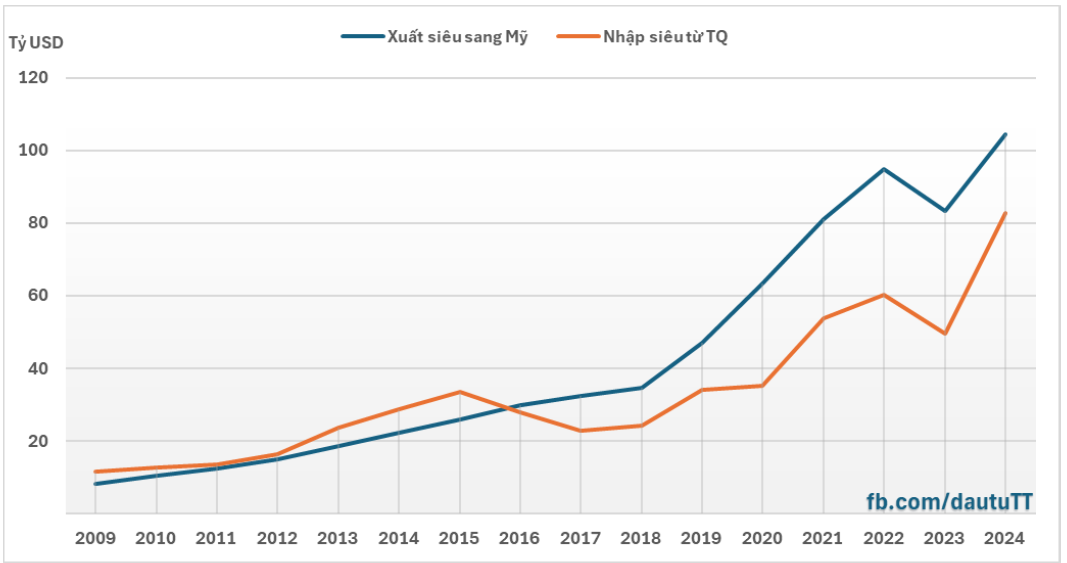 Qua biểu đồ này, Có thể thấy nước mình xuất siêu tăng bn thì nhập siêu tăng gia tốc tương tự bấy nhiêu → Chứng tỏ nhập từ TQ rất nhiều, tức thặng dư của VN gần như là hàng TQ và đương nhiên Mỹ cũng biết điều đấy