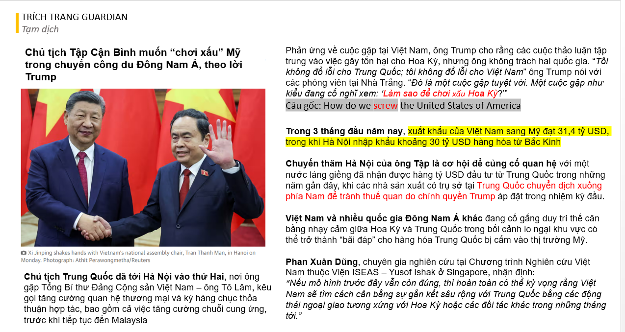 Theo trang The Guardian, trong 3 tháng đầu năm nay, xuất khẩu của Việt Nam sang Mỹ đạt 31,4 tỷ USD, trong khi Hà Nội nhập khẩu khoảng 30 tỷ USD hàng hóa từ Bắc Kinh