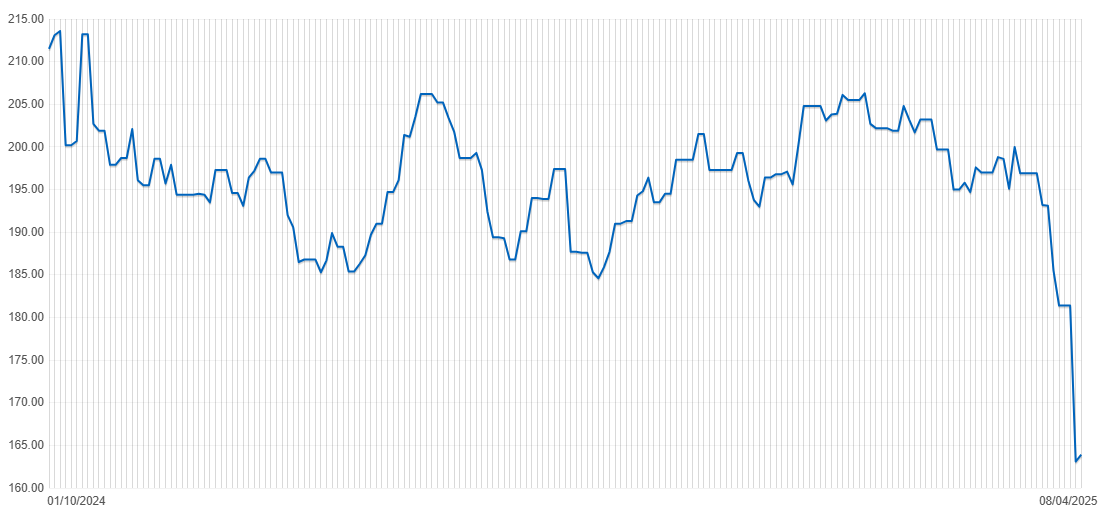 Kinh doanh trong 1 lĩnh vực là bán ra các sản phẩm chính như săm lốp ô tô, găng tay,giày dép (mảng phụ), khai thác và bán mủ cao su (hoạt động chính) thì biến động lợi nhuận của DRI phụ thuộc rất lớn và giá cao su thế giới, chart ở trên là giá cao su thế giới trong giai đoạn vừa qua khi Tổng thống Donald Trump quyết định đưa ra thuế đối ứng với các quốc gia có hoạt động trao đổi thương mại với Mỹ. Chính hành động này đã gây ra một tín hiệu đáng ngại về suy thoái toàn cầu, trong những ngày qua chúng ta đã chứng kiến TTCK trên toàn cầu lao dốc, có những quốc gia như Đan Mạch,… ngắt mạch ngừng giao dịch (điều chỉ xảy ra 1-2 lần trong lịch sử chứng khoán).