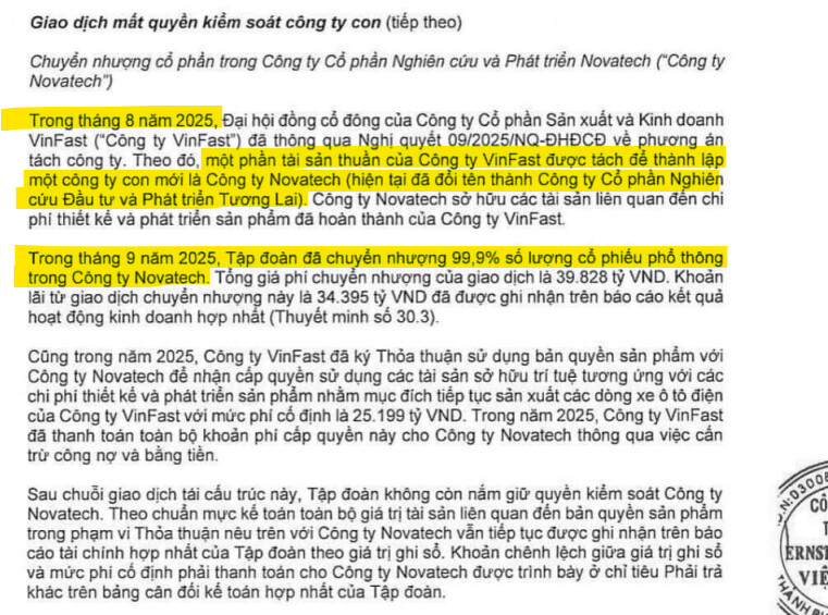 Ở một diễn biến khác, tháng 8/2025, Vingroup thực hiện chia tách CTCP Sản xuất và Kinh doanh VinFast. Một phần VinFast được tách để thành lập CTCP Nghiên cứu và Phát triển Novatech (hiện có tên mới là CTCP Nghiên cứu Đầu tư và Phát triển Tương Lai). Tới tháng 9, Vingroup đã chuyển nhượng 99,9% vốn Novatech với tổng giá phí chuyển nhượng là 39.828 tỷ đồng, lãi từ giao dịch này là 34.395 tỷ đồng.
