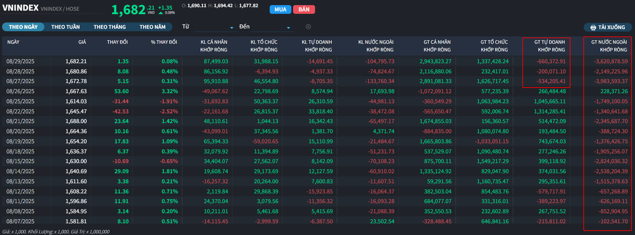 Nhà đầu tư tổ chức & khối ngoại: Bán ròng mạnh trong 20 phiên, áp lực gia tăng cận lễ. Nguyên nhân chính: tỷ giá và dòng tiền toàn cầu dịch chuyển về Mỹ. Lưu ý, VN-Index nằm trong top 3 chỉ số tăng mạnh nhất thế giới từ tháng 4/2025 đến nay, nên áp lực chốt lời càng rõ nét.
