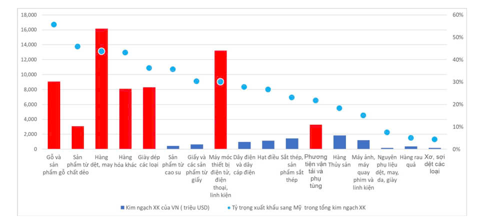 - Ngành gỗ: có thể chịu tác động lớn do chỉ chiếm 5% tỷ trọng nhập khẩu của Mỹ, dễ bị thay thế.