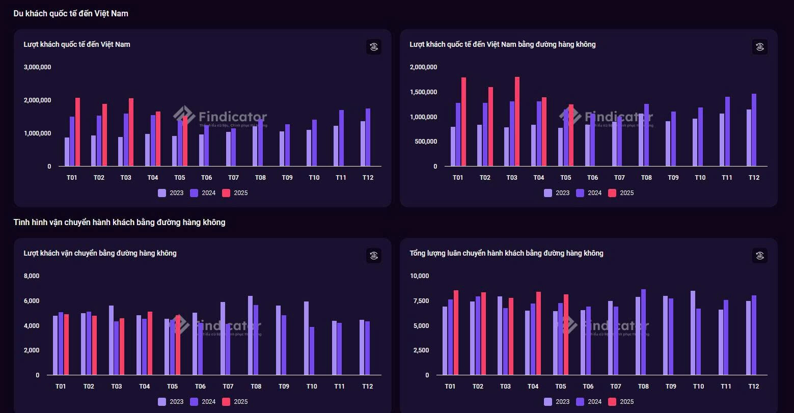 Lượt khách quốc tế bắt đầu tăng trưởng chậm lại. Khách nội địa thì phục hồi khá ổn các tháng gần đây.