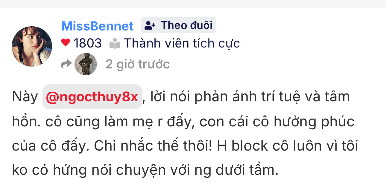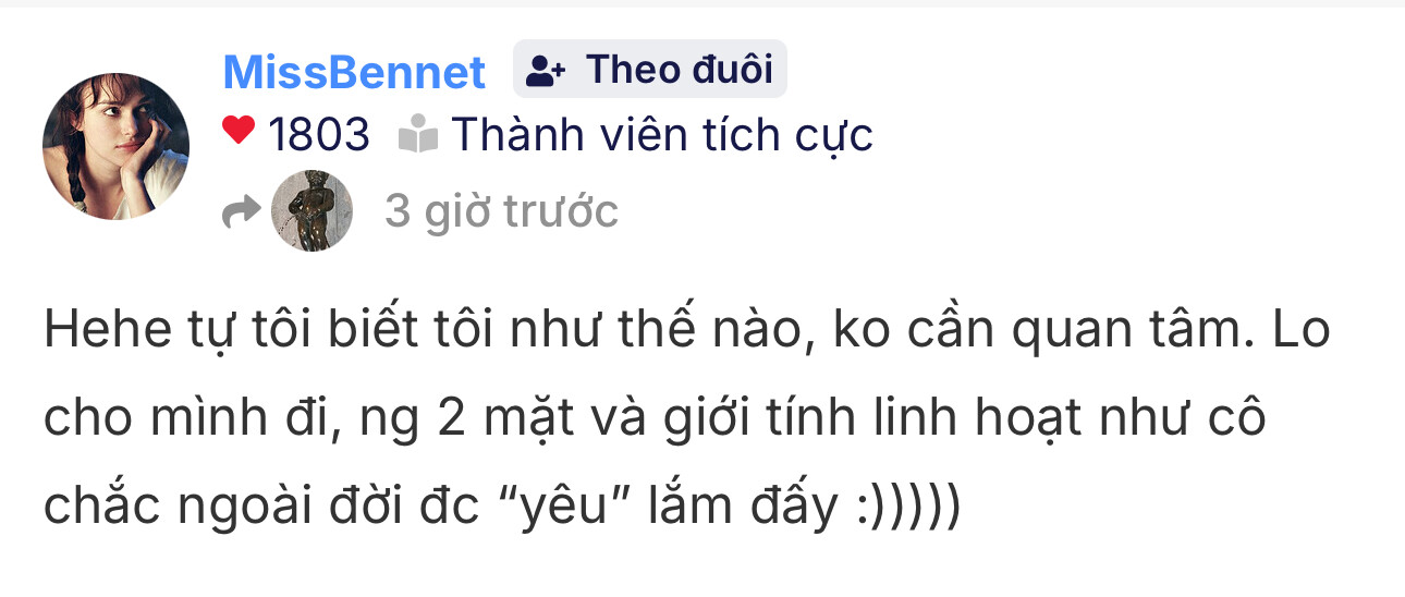 Gần nhất là chửi nhau với các nick clone mà bọn c khẳng định là Jean đó, có chứng cứ ko? Có quy chụp ko? Có sợ ảnh hg uy tín khi chưa đc Mod xác nhận ko? Rồi cả quy chụp Nguyen Dien cắm cờ pic c và chửi xéo e ý lung tung xoè nữa. Sau đó c có bảo nhận nhầm ng ko? Có xin lỗi ng ta vì nhận nhầm ko hay mặc định mình đúng và quay lưng bỏ đi ![]()