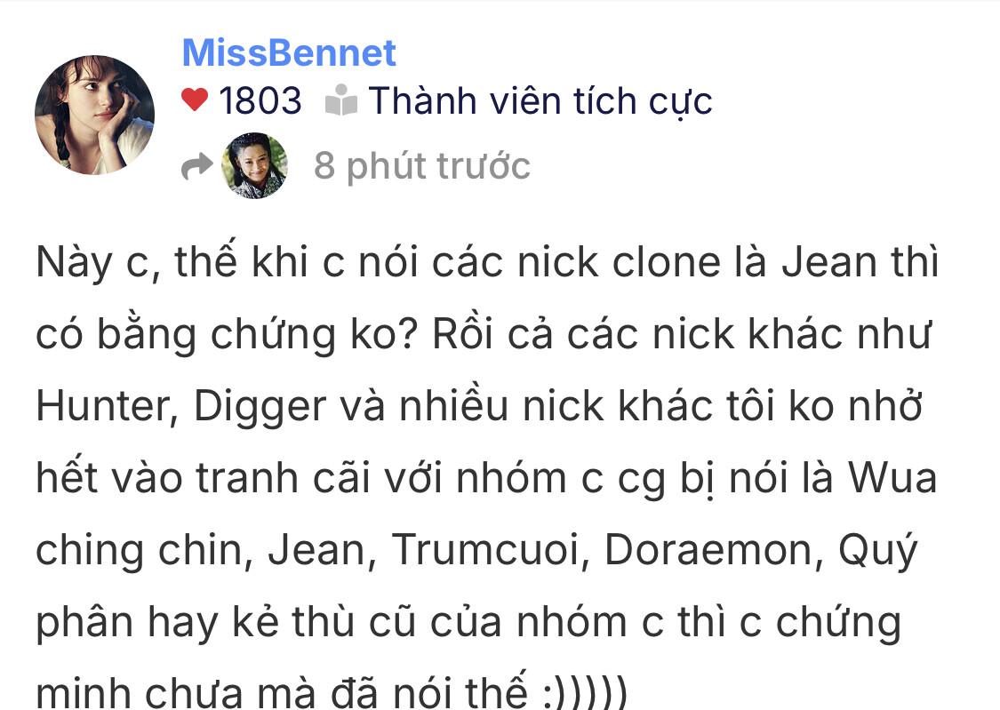 Này c, thế khi c nói các nick clone là Jean thì có bằng chứng ko? Rồi cả các nick khác như Hunter, Digger và nhiều nick khác tôi ko nhở hết vào tranh cãi với nhóm c cg bị nói là Wua ching chin, Jean, Trumcuoi, Doraemon, Quý phân hay kẻ thù cũ của nhóm c thì c chứng minh chưa mà đã nói thế :)))))