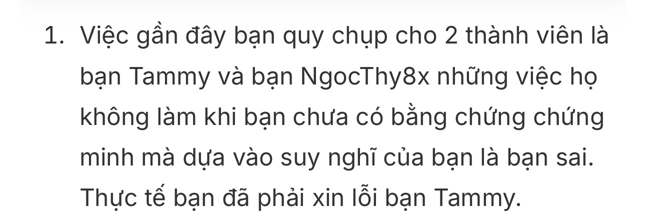- Việc gần đây bạn quy chụp cho 2 thành viên là bạn Tammy và bạn NgocThy8x những việc họ không làm khi bạn chưa có bằng chứng chứng minh mà dựa vào suy nghĩ của bạn là bạn sai. Thực tế bạn đã phải xin lỗi bạn Tammy.