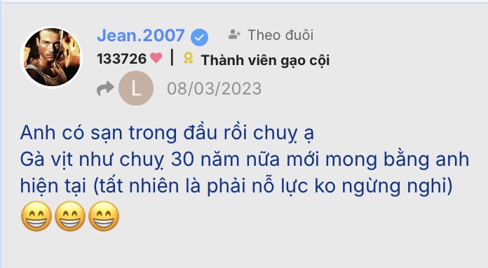 Jean đầu có sạn nên cả F này là gà vịt cho Jean hết 30 năm sau Jean mấp mé 90 tuổi thì ae mới mong bằng Jean =)))