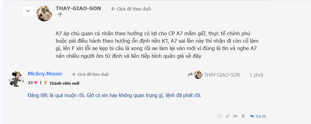 A7 áp chủ quan cá nhân theo hướng có lợi cho CP A7 mắm giữ, thực tế chính phủ buộc pải điều hành theo hướng ổn định nền KT, A7 sai lần này thì nhận đi còn cố làm gì, lên F xin lỗi ae kẹp bi câu là xong rồi ae làm lại ván mới vì đúng là tin và nghe A7 nên nhiều người ôm từ đỉnh và liên tiếp bình quân giá về đây