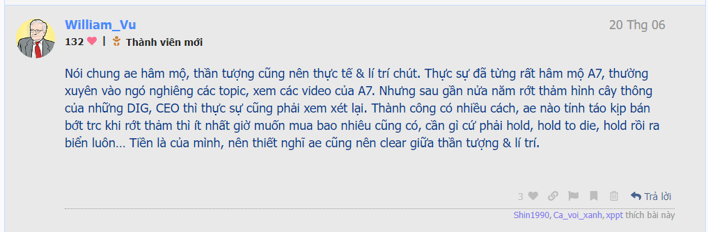 Anh bẩu này các chú: a7 hô dig và ceo từ rất lâu rồi. Từ khi DiG và Ceo còn nhưng giá 25 và 20 rồi sau đó nó phi lên cả 100k/ cổ. Thế những ai fomo theo a7 từ giá 25 ấy, chốt lên 80k. Cổ có có cho anh 7 hay gia đình anh 7 miếng nào không? Còn mấy ông mua dig hay ceo giá 100k rồi lỗ là vì gì? Là vì tham thôi. Mua là do tay mình đặt lệnh, phải tự chịu. Còn chuyện kêu la, om xòm trên cái diễn đàn ảo này là bình thường. Các chú ra ngoài đời thật ấy, vào các chợ truyền thống của mình ấy, chửi nhau nó còn inh ỏi, thậm trí đánh nhau, chém nhau cũng là bình thường. Đấy đời thực nó còn diễn ra như thế huống chi trên mạng ảo này. Thế nên, a7 trên này đôi lúc có bỗ bã chửi bới cũng là bình thường, có j mà các ông phải làm như chuyện tầy đình, kinh thiên. Tôi thì thấy a7 ít ra khi lên sóng, livestream ống ấy rất lịch sự, tử tế, có tiếng nào là chửi bới không? Các ông trên này lớn rồi, ít ra cũng có trải nghiệm đời rồi, đừng có văn hoá đổ lỗi, tham thì chịu thôi. Thế nhé! Còn ông nào muốn chửi bới chim lợn anh a7, gặp tôi. Tôi giải đáp cho, anh 7 mệt rồi thì tôi đáp lời hộ anh ấy cho. @Sieucophieu12345 giờ cần nghỉ ngơi sau những biến cố đau thương.