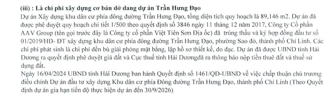- Dự án Trần Hưng Đạo - 8.9ha- trọng điểm. Điểm mấu chốt là dự án đã có thông báo đóng tiền sử dụng đất, tức đã chốt => dự kiến sớm có thông tin về cấp Sổ đỏ cho dự án. Đối với dự án này, còn một điểm rất đáng quan tâm là tiến độ xin giấy phép khai thác khoáng sản, do dự án có phần đồi đá. Hồi giữa 2020, doanh nghiệp khi đó thiếu hiểu biết nên không xin giấy phép khai thác khoáng sản (vì nghĩ là không cần), nên bị tuýt còi là buộc phải hoàn trả nhà nước 12 tỷ tiền bán đá vật liệu, sau khi trót cho máy vào xúc 1 phần. DN đã phải trả lại số tiền đó hồi tháng 1-2024. Đặt bài toán khi được cấp giấy phép khai thác khoáng sản, dự kiến chỉ riêng phần đá khai thác từ dự án cũng kiếm vài chục tỷ, được ghi nhận là doanh thu cho doanh nghiệp.