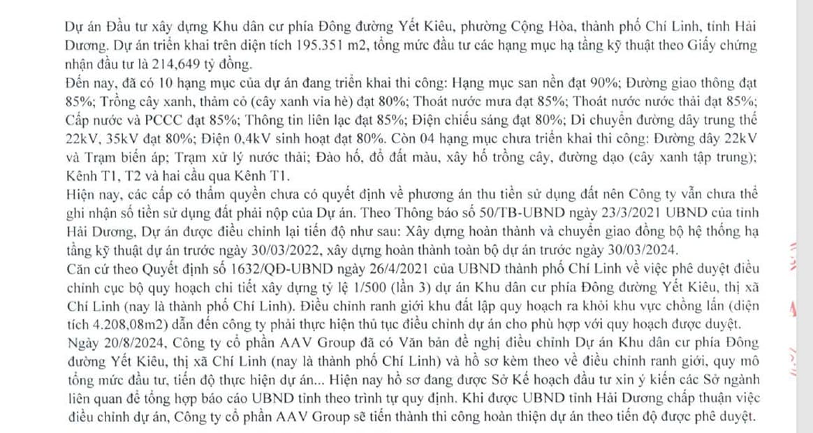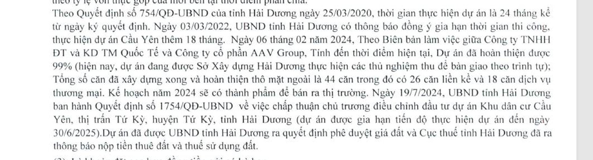 - Khu dân cư Cầu Yên: AAV có 35% lợi ích. Dự án đã xong tới 99%. Đáng chú ý là dự án đã xác định được tiền sử dụng đất và đã có thông báo => dự kiến sớm có thông tin mở bán and trước mắt book 44 căn liền kề và dịch vụ thương mại.