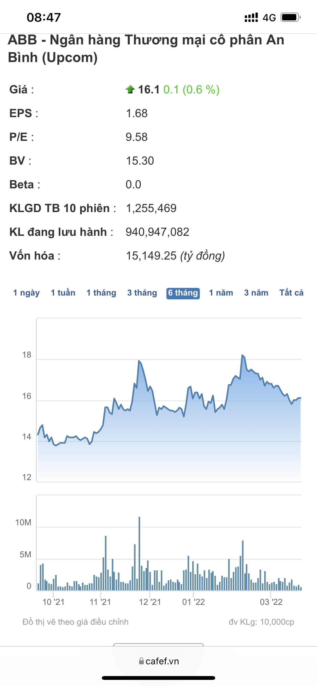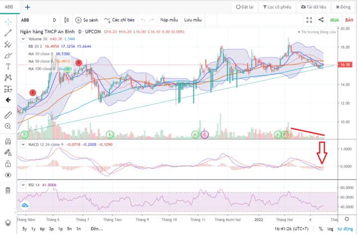 Kết thúc ngày 17.01.2022, cổ phiếu ABB chốt phiên giao dịch ở mức 21.100 đồng/cổ phiếu, giảm 3,21% so với phiên gần nhất. Đây là xu hướng khó tránh khi VN-Index vừa có phiên giảm mạnh nhất trong vòng 5 tháng trở lại đây, mất hơn 43 điểm so với tham chiếu, rơi xuống 1.452,83 điểm và hàng trăm cổ phiếu đỏ sàn. Tuy nhiên, cổ phiếu ABB được đánh giá vẫn giữ được độ hấp dẫn và triển vọng đầu tư nhờ hiệu quả kinh doanh và đà tăng trưởng ổn định. Đến cuối năm 2021, tổng tài sản ABBANK đạt 121.620 tỉ đồng, lợi nhuận trước thuế đạt 1.979 tỉ đồng, hoàn thành kế hoạch được giao. Cũng trong năm 2021 vừa qua, ABBANK đã mời Tổ chức Tài chính Quốc tế thực hiện đánh giá năng lực quản trị và đưa ra lộ trình cải thiện hàng năm theo các tiêu chuẩn quản trị tốt nhất mà quốc tế và Việt Nam đang áp dụng.
