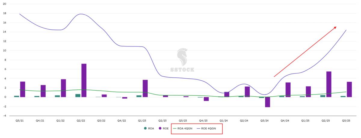 Chỉ số vàng: ROE bật tăng từ mức trung bình 9.2% lên 16.5%. Đây là tín hiệu quan trọng nhất xác nhận chất lượng tài sản đã tốt lên, tiền làm ra là tiền thật.