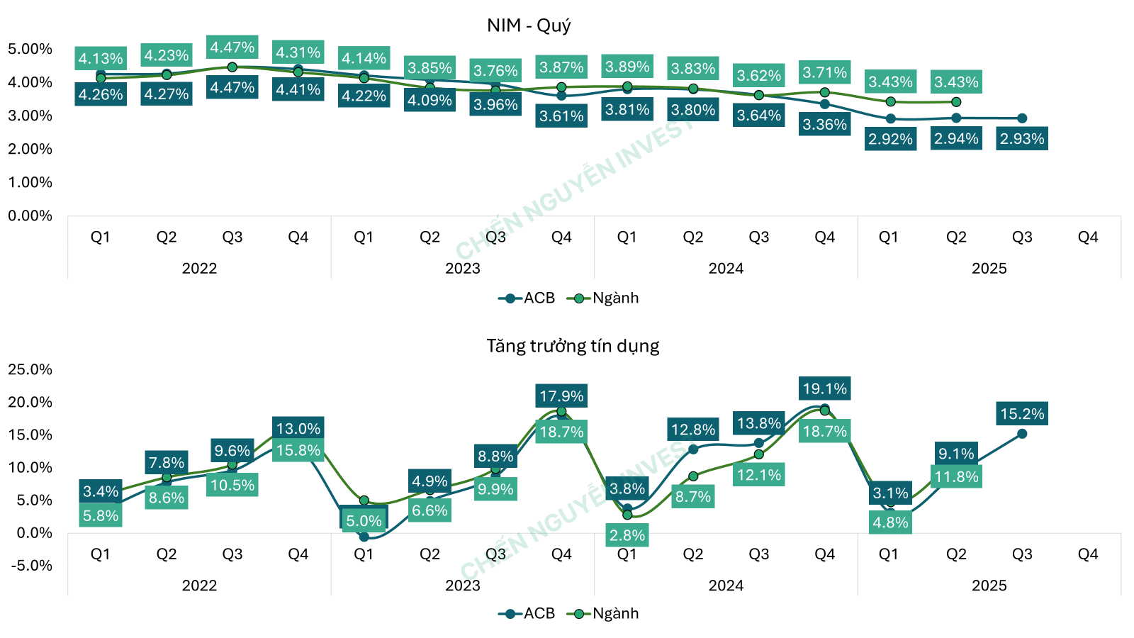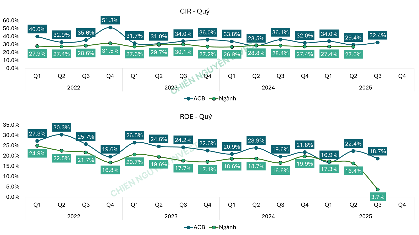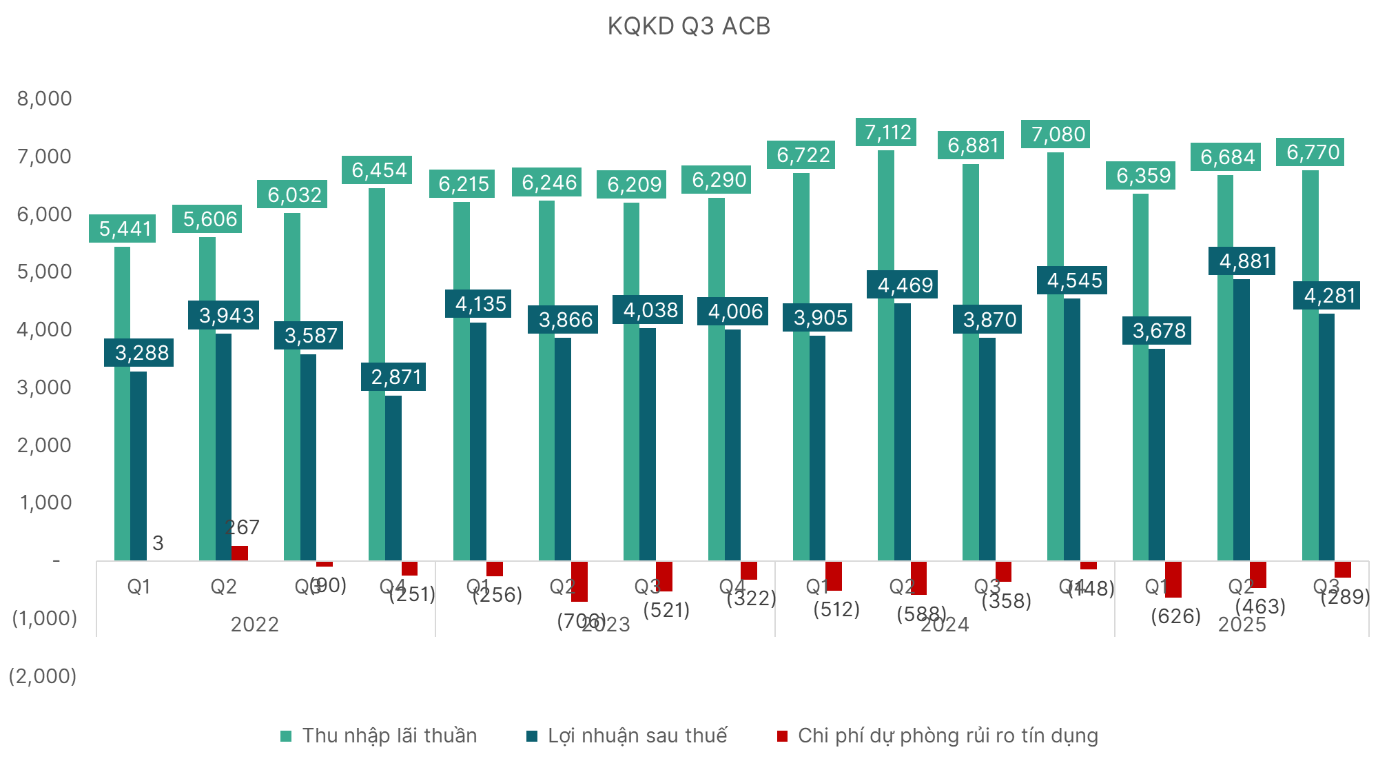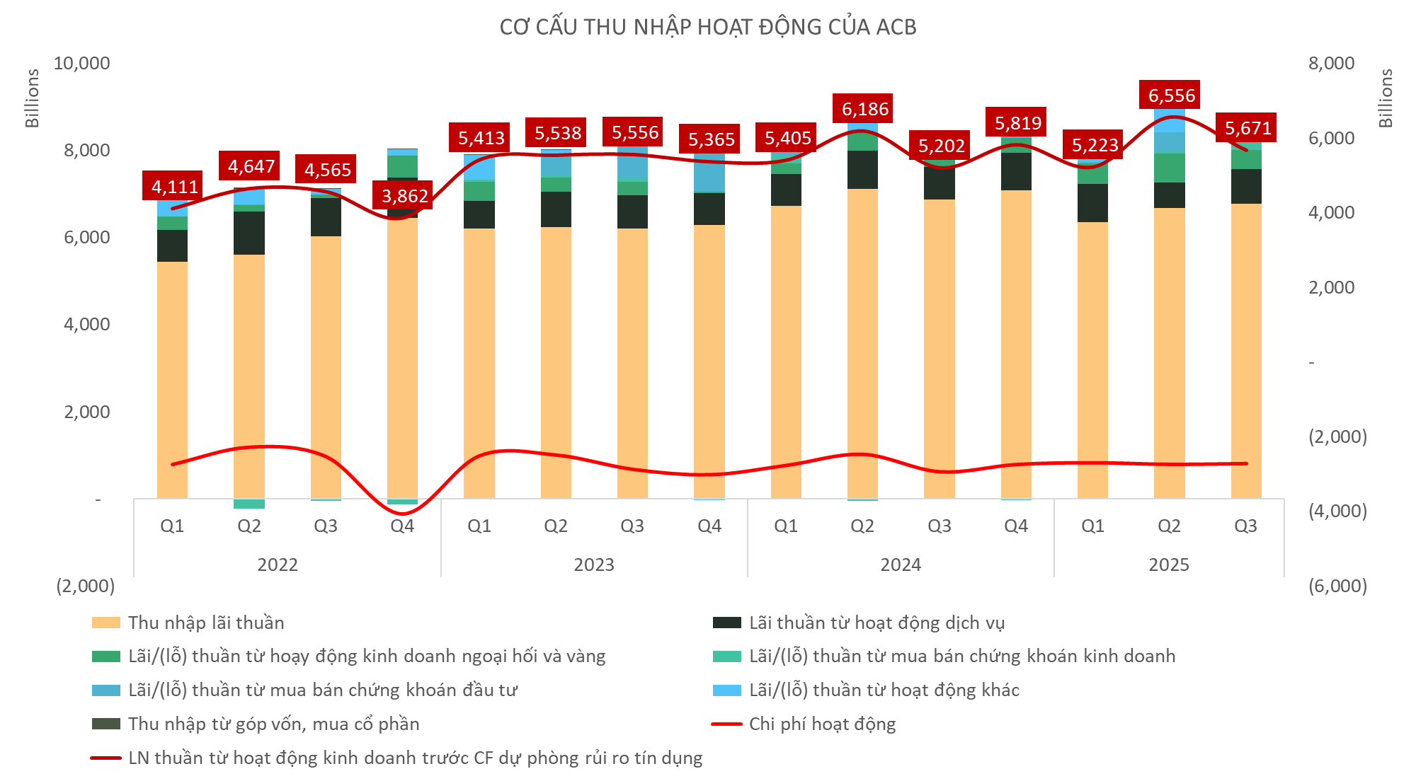 Trong quý 3 năm 2025, ACB ghi nhận mức giảm nhẹ trong thu nhập từ hoạt động chính—lãi thuần giảm 2% so với cùng kỳ năm ngoái, phản ánh xu hướng suy giảm của hoạt động cho vay. Dù lợi nhuận sau thuế lại tăng 11%, nhờ giảm được chi phí trích lập dự phòng và chi phí nhân viên, điều này cho thấy ngân hàng đã kiểm soát tốt các khoản chi phí, giảm thiểu tác động tiêu cực từ thị trường. Biểu đồ sau minh họa rõ ràng sự biến động này: